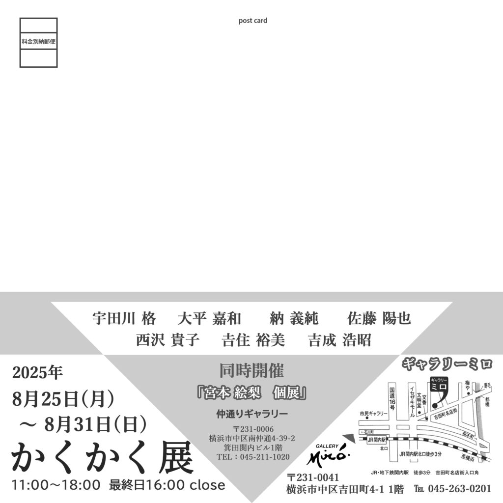 2025年8月2日 / 最終更新日時 : 2025年8月2日 宇田川 格 展覧会 かくかく展 会期:2025年8月25日〜31日 11:00〜18:00(最終日16:00まで) 会場:ギャラリーミロ Facebooktwitter